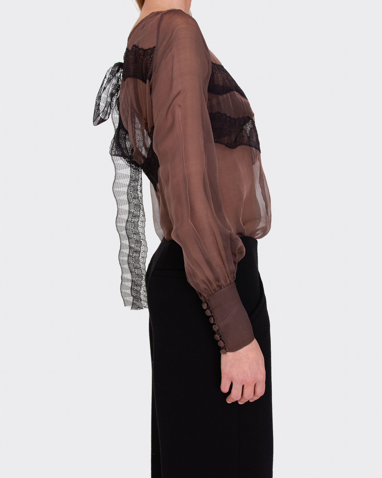The Aurelie in violet — the same beloved silhouette in a rich, saturated hue. Silk georgette drapes with effortless movement, while delicate button closures and elongated cuffs nod to the ateliers of Paris. A blouse that transitions from afternoon to evening without apology.